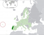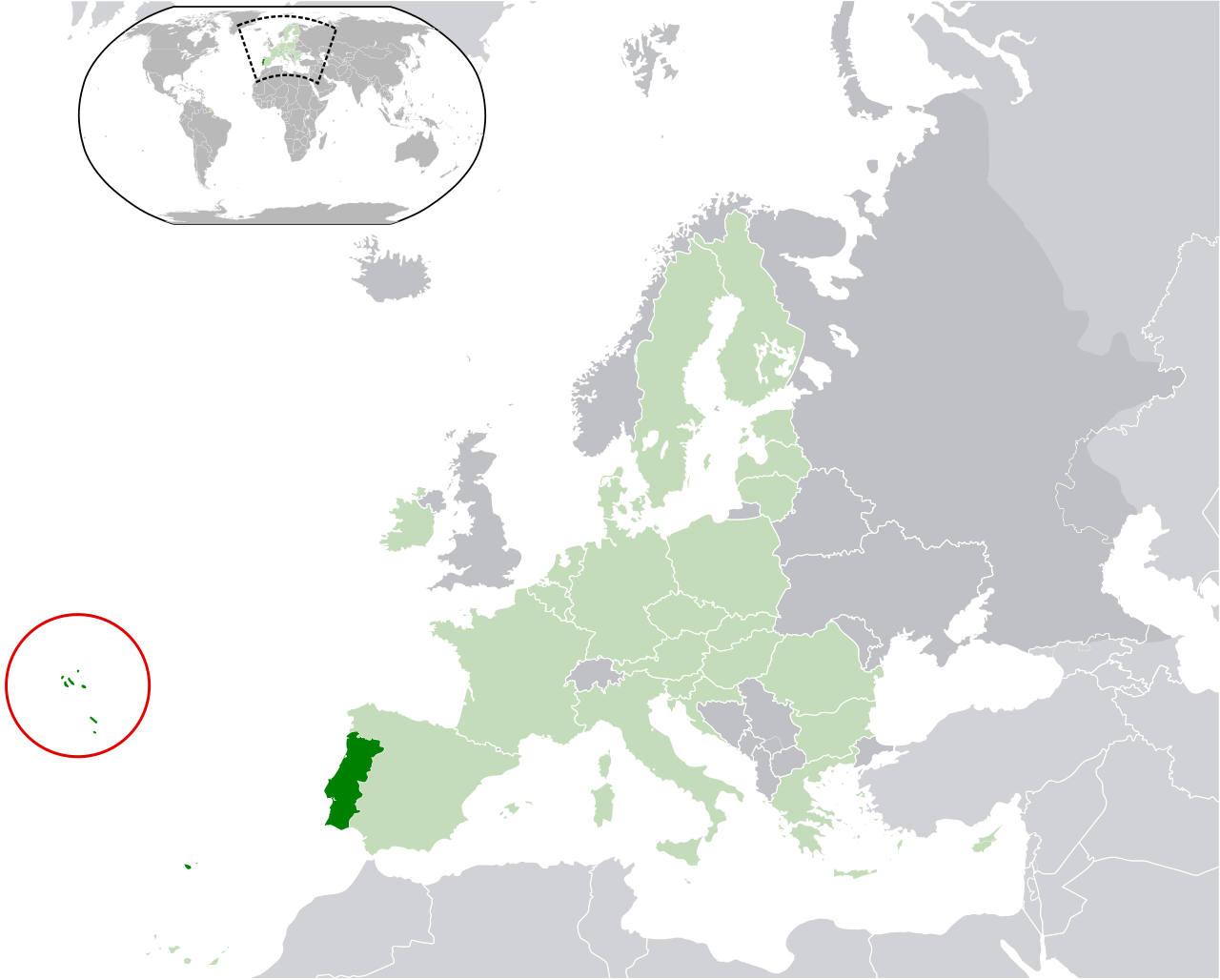 Location of the Azores within Portugal (dark green) and the European Union (light