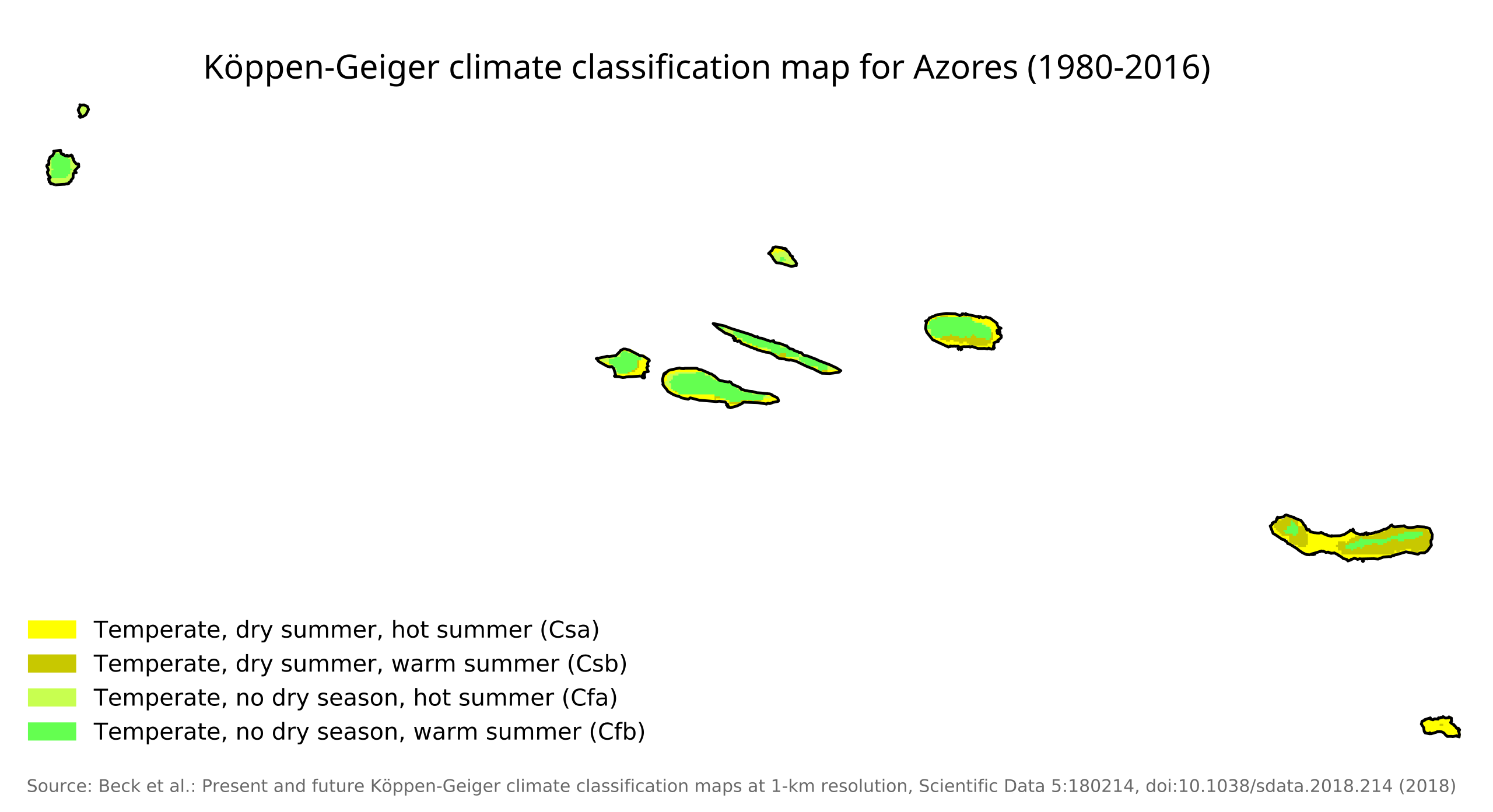 Azores (blue), Madeira (green) and the Canary Islands (yellow) in the northern Atlantic