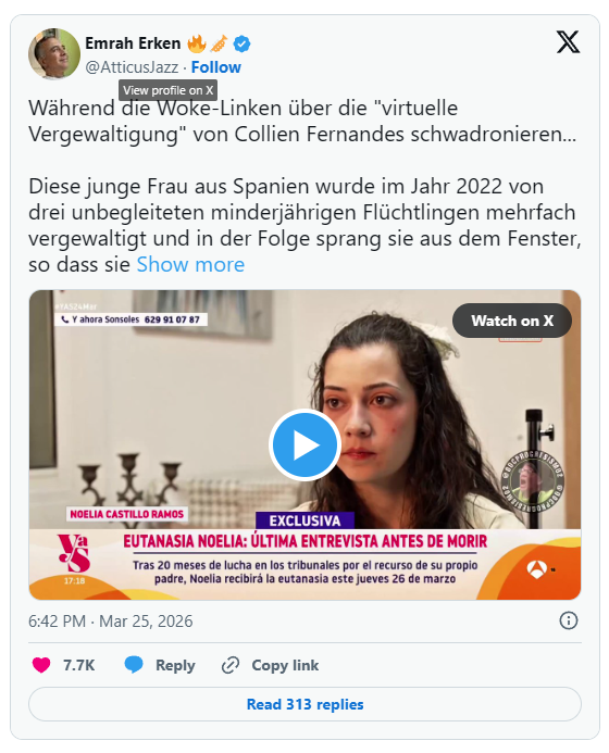 Noelia Castillo Ramos, 25-godišnjakinja iz Barcelone, eutanazirana je 26. ožujka 2026. Mladu ženu je 2022. godine više puta silovalo nekoliko mladića u državnoj ustanovi. Trauma je dovela do pokušaja samoubojstva u kojem je pretrpjela paraplegiju. Umjesto da dosljedno procesuira počinitelje i osigurava granice, španjolska država joj je ponudila “pomoć” u obliku okončanja života. Država koja je nije uspjela zaštititi sada će ju sama ubiti.
