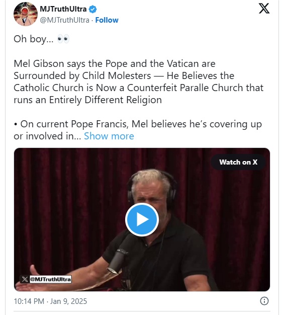 Mel Gibson says the Pope and the Vatican are Surrounded by Child Molesters — He Believes the Catholic Church is Now a Counterfeit Paralle Church that runs an Entirely Different Religion