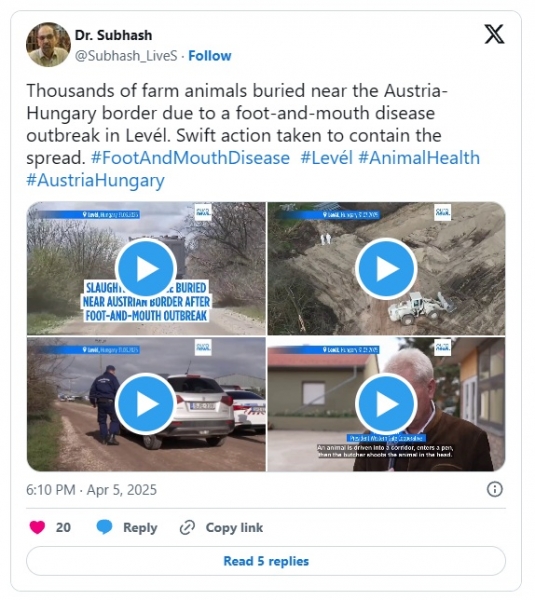 Thousands of farm animals buried near the Austria-Hungary border due to a foot-and-mouth disease outbreak in Levél. Swift action taken to contain the spread.