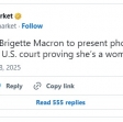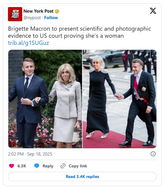 The First Lady of France, Brigitte Macron, plans to present scientific and photo evidence in court to prove her sex. French President Emmanuel Macron and his wife filed a defamation lawsuit in the U.S. against right-wing influencer Candace Owens who claimed on her platforms the first lady was born male.