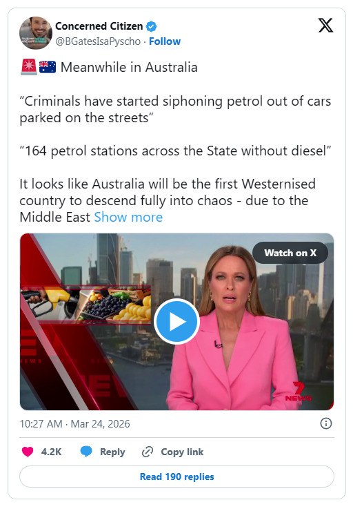It looks like Australia will be the first Westernised country to descend fully into chaos - due to the Middle East conflict, with fuel shortages, rationing & that inevitable increased crime hitting the streets.