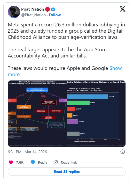 The result is a huge compliance burden shifted onto the app stores while Meta avoids the same rules. Public records show heavy lobbying, fast-created advocacy groups, and funding ties that raise questions about who is really behind the "child safety" push.