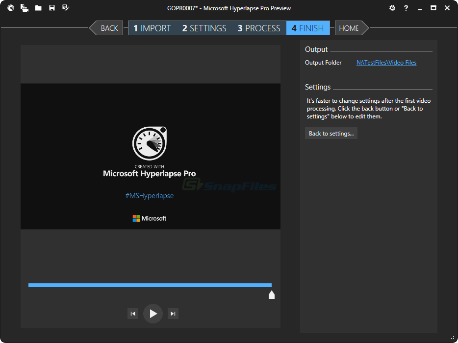 Simply import a video file (mp4, .mov or .wmv), choose from a few processing and speed control options and Hyperlapse will process the video to create a smooth time-lapse version of the original.