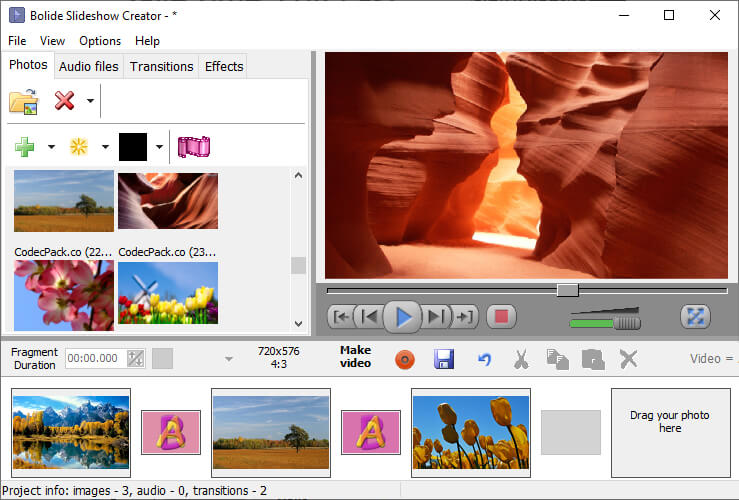 With this free photo slideshow creator software program you can make a video slideshow using almost any digital photo graphic file image format. Using Bolide Slideshow Creator, you can drop many photos to the timeline, tell the program to add transition effects automatically (either the random or selected ones) and save your slideshow as a video file.