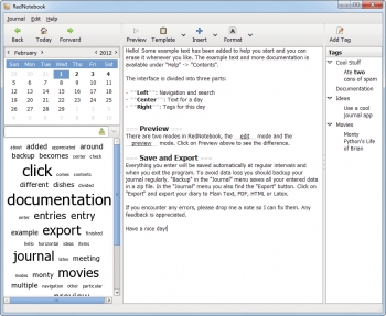 RedNotebook is a tag based notes manager and journal that uses word clouds that let you quickly access your frequently used items. The program uses a freestyle formatting approach, you can format entries ..