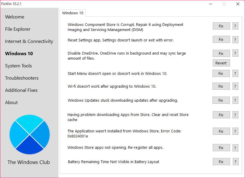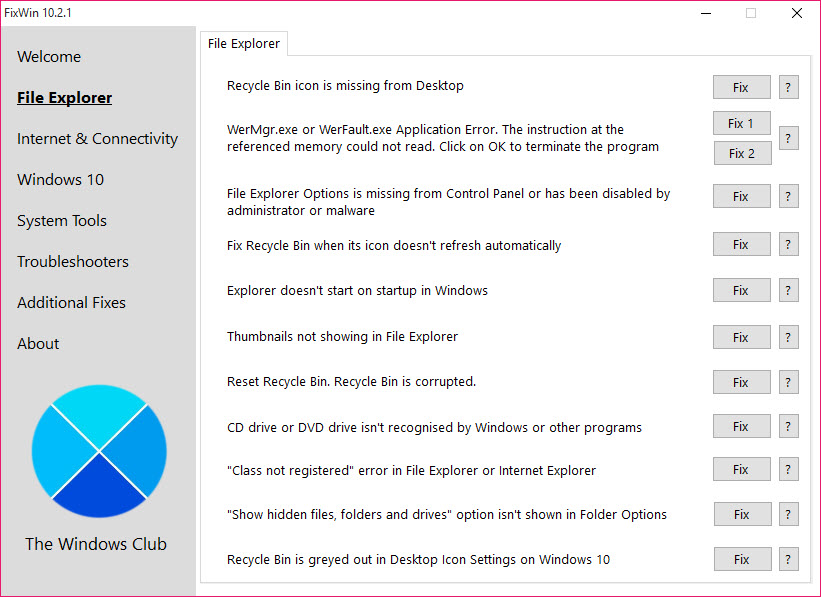 Intuitive and Easy To Use InterfaceFixWin has a simple and intuitive interface divided into six tabs as follows: - File Explorer – fixes problems with browsing files and folders, recycle bin, optical drive