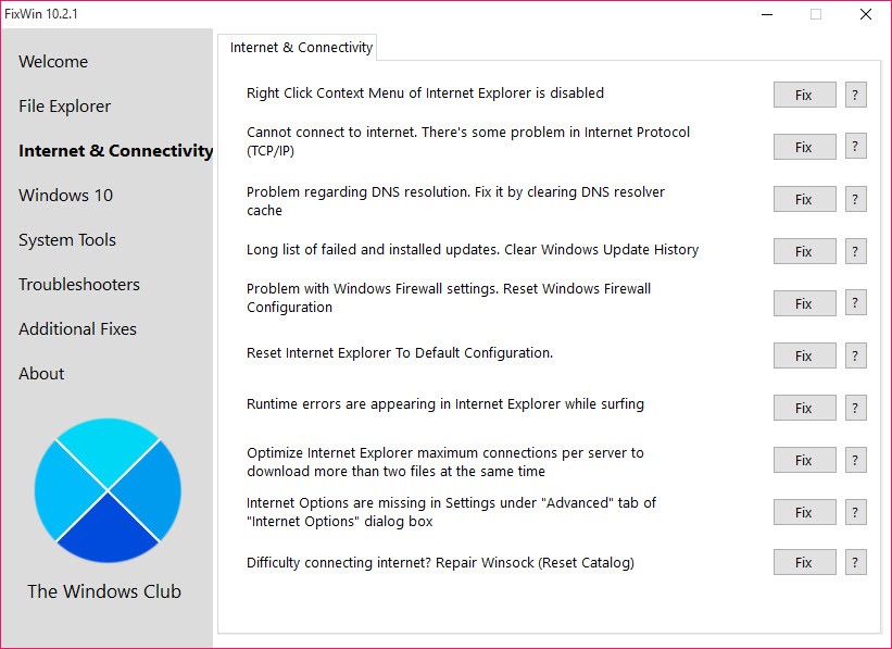 Another big advantage of using FixWin for fixing problems is that it’s lightweight and portable, so you don’t have to install it to start using it. Instead, the application can be launched upon which you can solve the most common problems on your system without complications.