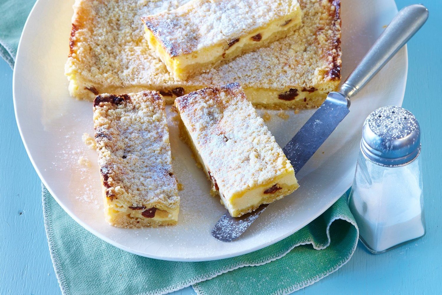 Globok pekač dobro namastimo z maslom. Vanj stresemo polovico suhe mešanice in jo čim bolj enakomerno razporedimo po celotni površini. Sledi plast skutinega nadeva, ki ga z lopatko ali nožem razmažemo po suhih sestavinah in po vrhu lepo pogladimo. Po nadevu potrosimo preostanek suhe mešanice.