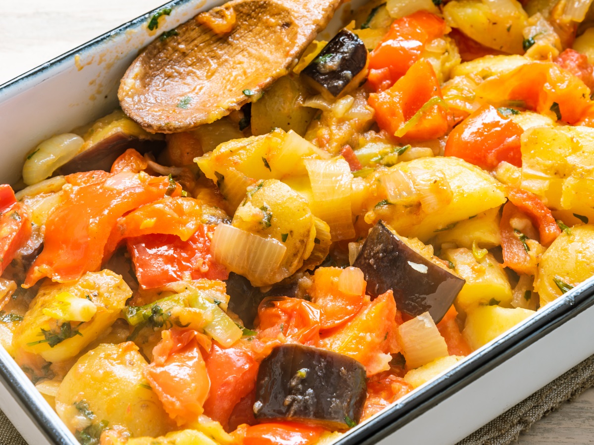 – 8 manjših krompirjev – po 1 rdeča, rumena in zelena paprika – večja čebula – večji paradižnik – 3 pločevinke tunine (v olju ali lastnem soku) – sol, bazilika
