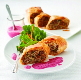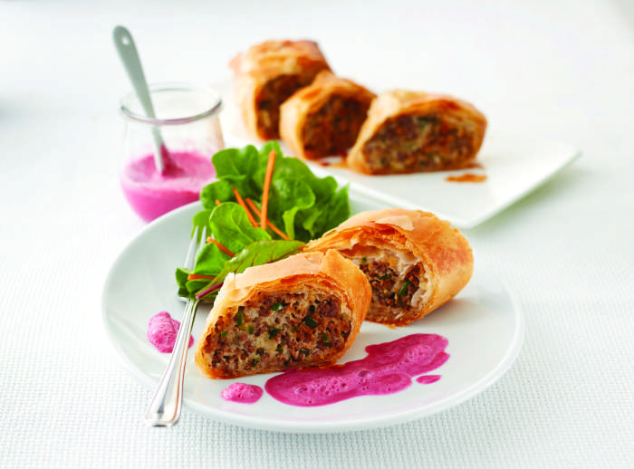 100 g mlade čebule 400 g mešanega mletega mesa 3 žlice olja 100 g puste skute 50 g krušnih drobtin 1 jajce 2 žlički gorčice 2 žlici svežega origana 1 žlička soli, poper 250 g vlečenega testa za zavitke