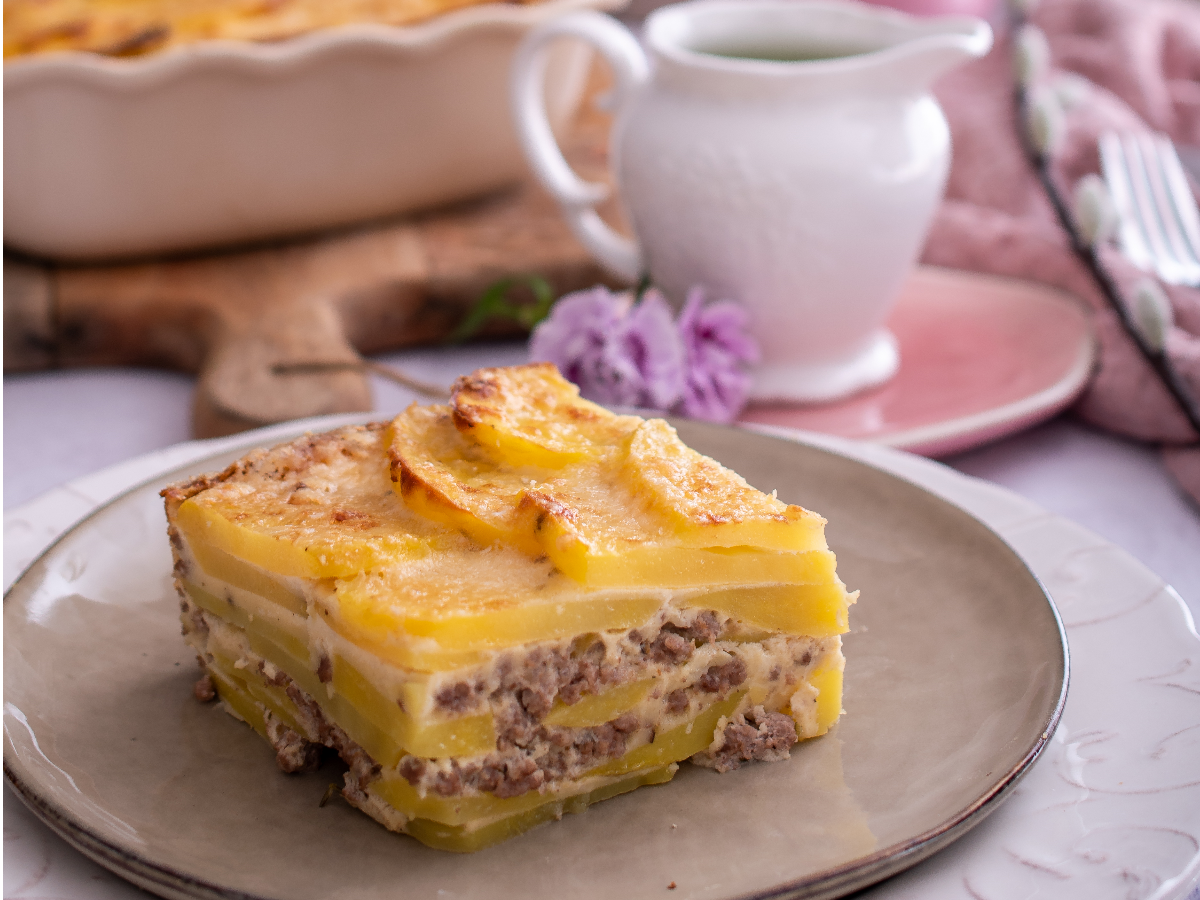 – 1,2 kg krompirja, 0,5 kg mletega mešanega mesa – 180 g kisle smetane – velika čebula, 2 zajemalki bistre nedeljske juhe – 2 žlici oljčnega olja, timijan, majaron, sol, poper