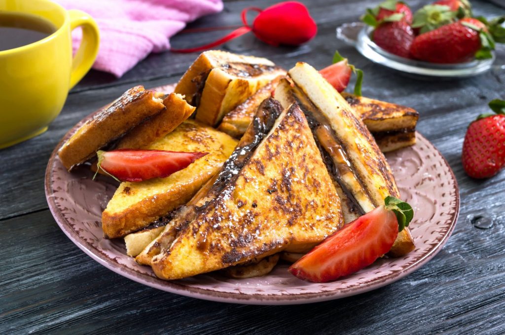 8 kosov postanega kruha po želji 8 žlic. Nutelle 2 jajci 240 ml mleka 2 žličk. vaniljevega ekstrakta 2 žlic. masla sladkor v prahu za posip sveže jagode ali drugo sadje