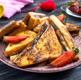 Na kose kruha namažemo Nutello in naredimo 4 sendviče. V plitvi posodi zmešamo jajci, mleko, sladkor in vaniljev ekstrakt.