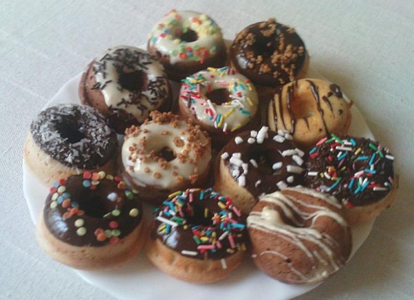 Vse sestavine damo v večjo posodo in zmešamo z metlico. Namastimo pekač za krofe in porazdelimo maso v odprtine pekača.