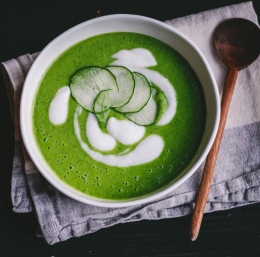 4. Osvežilno juho nalijemo v globoke krožnike ter okrasimo z jogurtom in tanko narezanimi lističi kumare.