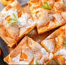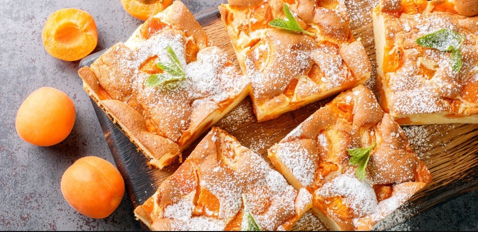 Pripravljeno maso pretresemo v pekač in jo z lopatko enakomerno razporedimo po celotni površini. Po masi razporedimo polovičke marelic/ali potrosimo koščke sadja.