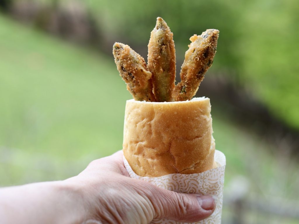 15 zelenih špargljev (za vsako štručko 3–4) 4 hot dog štručke 40 g moke 2 jajci sol 50 g drobtin olje za cvrenje špargljev namaz ali majoneza Špargljev namaz