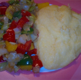 1/2 lončka polente 1 čebula 1/2 rumene paprike 1/2 zelene paprike 1/2 rdeče paprike česen sol* poper in začimbe po okusu