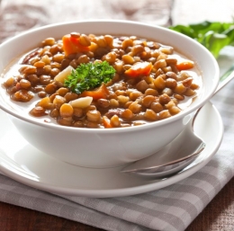 Čebulo in česen olupimo ter ločeno drobno sesekljamo. Korenje očistimo, operemo in narežemo na manjše koščke. Krompir olupimo, operemo in narežemo na malo večje koščke kot korenje. Stebelno zeleno in peteršiljevi korenino očistimo, operemo in drobno sesekljamo. Lečo preberemo, stresemo na cedilo, speremo pod tekočo vodo in dobro odcedimo.