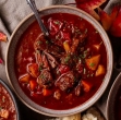3 žlice olja 750 g govejega bočnika 50 g rezin prekajene slanine 750 g čebule 2 žlici ostre mlete paprike 3 stroki česna 0,25 žličke mlete kumine 500 ml vode 2 paradižnika 1 zelena paprika 2 večja korenčka 500 g krompirja 5 feferonov 1 žlička soli 0,5 žličke sveže mletega popra