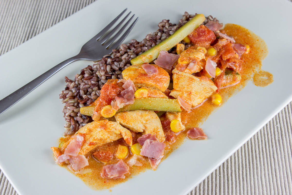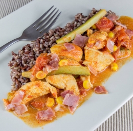350g Puranji zrezki 1 kos Čebula 1 strok Česen Žajbelj 250g Bučke 60g Šunka 140g Koruza - pločevinka Olje - olivno Sol Poper 500g Paradižnik - pločevinka, koščki 4dl Voda Jušna kocka 6 žlic Kisla smetana Sladkor - beli