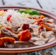 Govedino narežemo na manjše koščke, solimo in popramo.