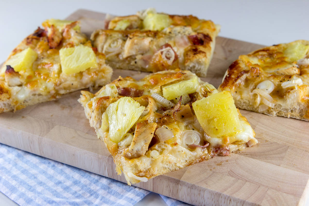 Testo premažemo s preostalo žar omako, nato pa obložimo s polovico narezane mocarele, piščančjim mesom, koščki narezanega ananasa, slanino in rezinami čebule. Na koncu damo na pizzo še preostalo mocarelo in popramo.