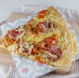 Naoljen pekač obložimo s testom. Na testo damo koščke paradižnika, obložimo z mocarelo in suho salamo. Pokapamo z oljem.
