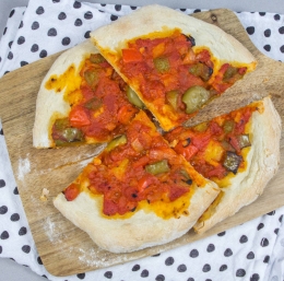 Testo obložimo s omako iz paprike, dodamo se narezane olive in pečemo 20 min na 230° C.