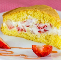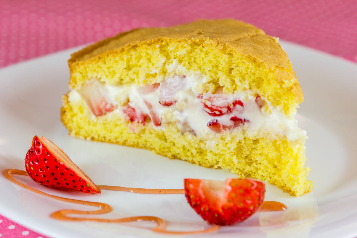 4 kosi Jajce - kokošje 2 žlici Voda 160g Sladkor - beli 160g Pšenična bela moka 0,5 kosi Pecilni prašek Jagode Sladka smetana