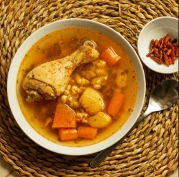 0.6 kg Piščančja bedra 2 x Korenje 1 x Velika čebula 3 žlice Moka Majaron Česen 2 x Krompir 1 žlica Olje Lovorjev list Vegeta