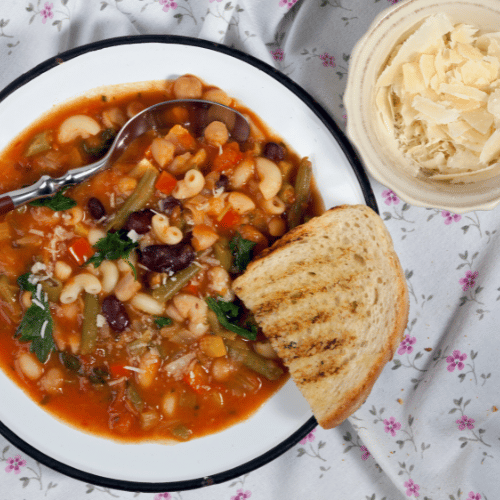Baziliko narežite ali na grobo sesekljajte. Ko je mineštra gotova, jo po potrebi začinite s soljo ali poprom.
