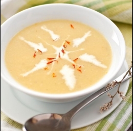 Segrejte veliko ponev na srednji do visoki temperaturi, dodajte malo olja ter na njem približno 8-10 minut pražite čebulo in korenje, dokler se ne zmehčata. Dodajte česen in ga pražite približno 1 minuto, nato dodajte žafran in piščančjo juho.