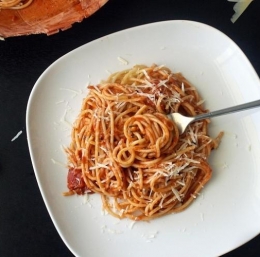 Ko serviramo na krožnik še poporamo in posujemo parmezan. Ponudimo še zeleno solato.
