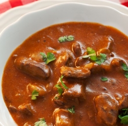 Timijan in peteršilj operemo in osušimo. Govedino temeljito operemo in osušimo s papirnatimi brisačkami. Nato jo narežemo na približno 2 cm velike kose. Čebulo olupimo in jo na drobno nasekljamo. Pečico segrejemo na 160 stopinj Celzija. Na kuhalnik pristavimo večjo ognjevarno kozico, v kateri segrejemo dve žlici olja. Vanjo stresemo tretjino mesa, ki ga na zmerni vročini med stalnim mešanjem pražimo približno 7 minut, da enakomerno porjavi.