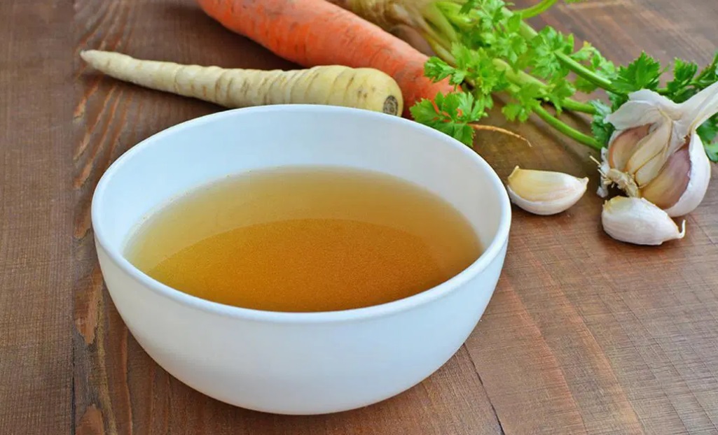 1 kg govedine s kostmi 3 korenja 1 korenina peteršilja 0,25 gomoljne zelene polovico paradižnika 1 manjši por 2 čebuli 2 stroka česna 1 ščepec soli 6 zrn črnega popra 1 lovorjev list 1 šopek peteršilja 1 vejica timijana 1 vejica majarona 1 vejica zelene malo luštreka