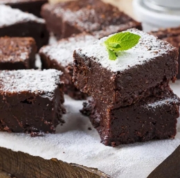5 Pečemo približno 25 minut, da se na vrhu zapeče skorjica, sredina pod skorjico pa ostane še rahla in sočna (ko pekač potresemo, se plast pod skorjico zatrese). Pustimo pecivo v pekaču, da se popolnoma ohladi. Nato ga narežemo na kocke in posipamo s sladkorjem v prahu.