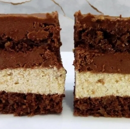 4 V zmes jajc in sladkorja postopoma vlivamo raztopljeno maslo s čokolado in moko s kakavom. Segrejemo pečico na 180 stopinj Celzija. Maso vlijemo v pekač velikosti 34×24, ki ga obložimo s peki papirjem.