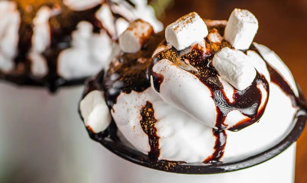 50,0 cl tekile 25,0 cl likerja Kahlua 12,0 cl likerja Tia Maria 100,0 cl goste vroče čokolade 15,0 cl stepene sladke smetane penice in čokoladni preliv za okras