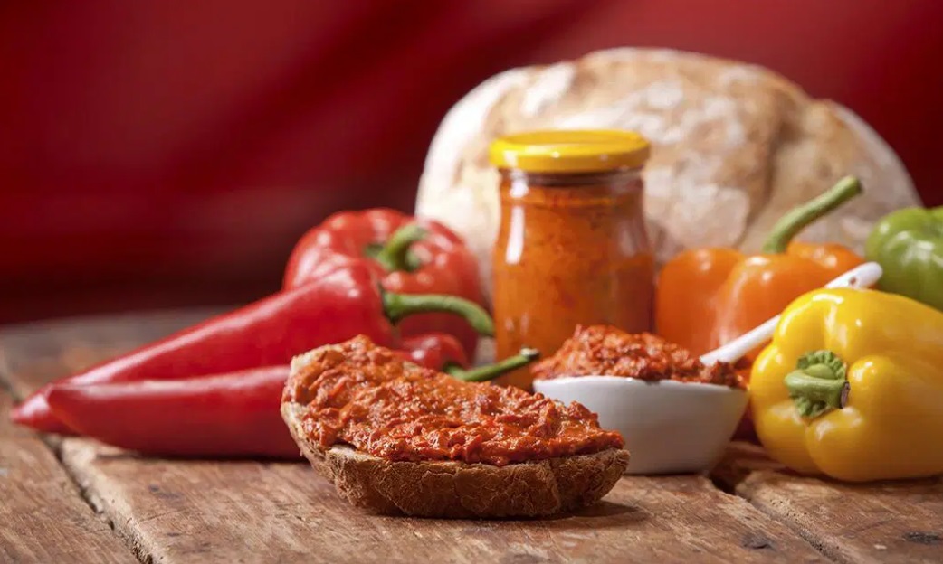 20 rdečih in rumenih paprik 2 mali čebuli 5 strokov česna 1 žlica soli 1 žlica sladkorja 1 dl jabolčnega kisa 1 dl vode 2 dl oljčnega olja 250 g gorčice 2 žlici paradižnikovega koncentrata mleti črni poper po okusu (1/2 čajne žličke ali več)