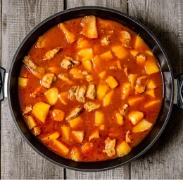 1/2 kg govedine, svinjine, tudi piščanca brez maščobe 1,5 kg krompirja 20 strokov česna 5 zrelih paradižnikov 2 žlici mlečnih koruznih zrn oljčno olje, lovor ali kumina košček čilija majaron, bazilika kanček vinskega kisa