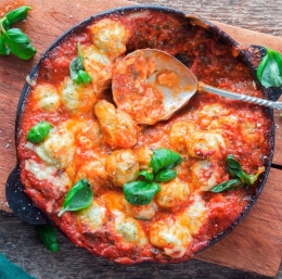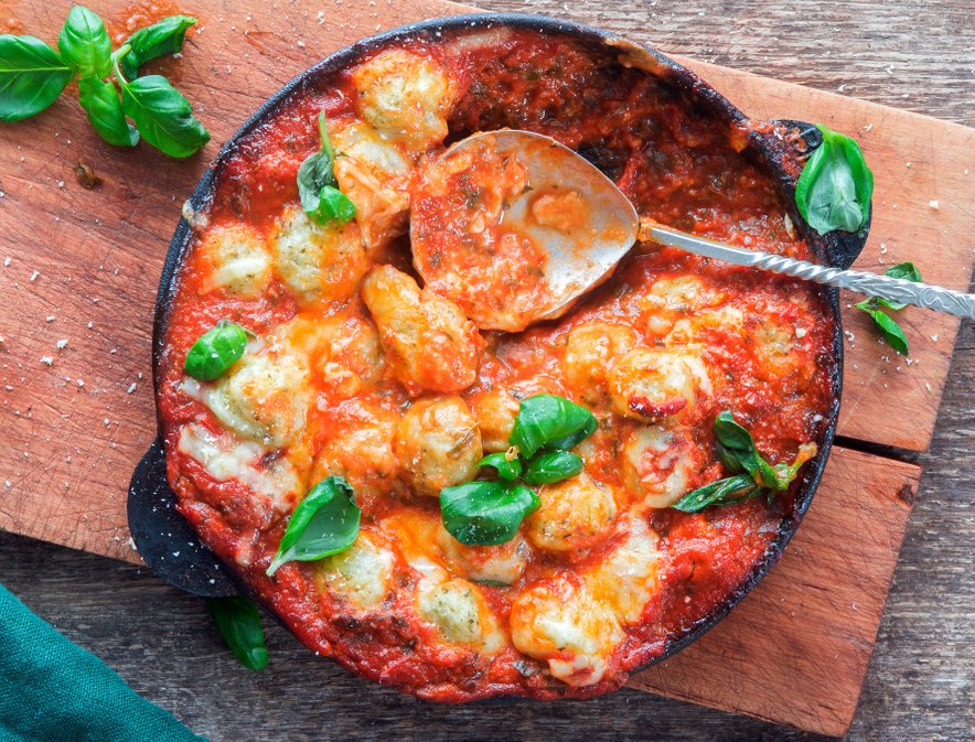 Krompirjevi njoki, paradižnikova omaka, obogatena z začimbami in mascarponejem, ter zapečena mocarela so popolna kombinacija za preprosto in okusno kosilo, primerno za vse dni v tednu.