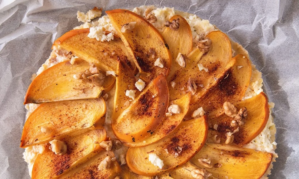 Kakijevo pecivo s skuto je mešanica nežnega testa, obogatenega z maslom in vanilijo, ki se popolnoma ujema s kremastim nadevom iz skute in sladkorja.