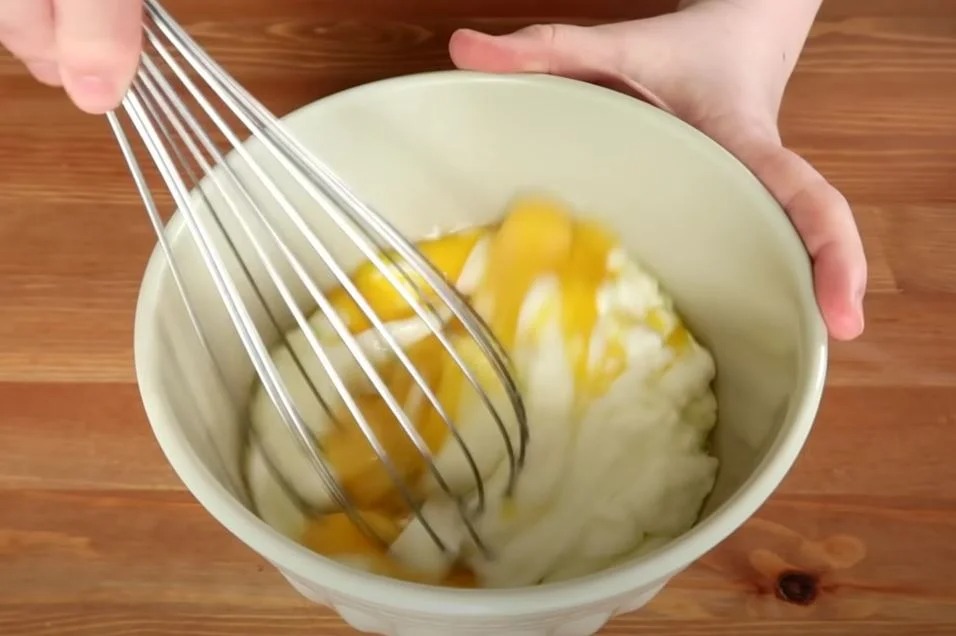 V posodo damo jogurt in 4 jajca. Dobro premešamo, da dobimo gladko zmes.