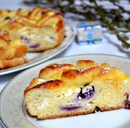 Vzhajano testo stresemo na pult, ga pregnetemo in pustimo nekaj minut počivati. Nato testo razvaljamo na pravokotnik, majhen košček damo na stran, da bomo na koncu spletli manjšo kitko. Testo premažemo z nadevom, posujemo borovnice in nato tesno zvijemo v zavitek.