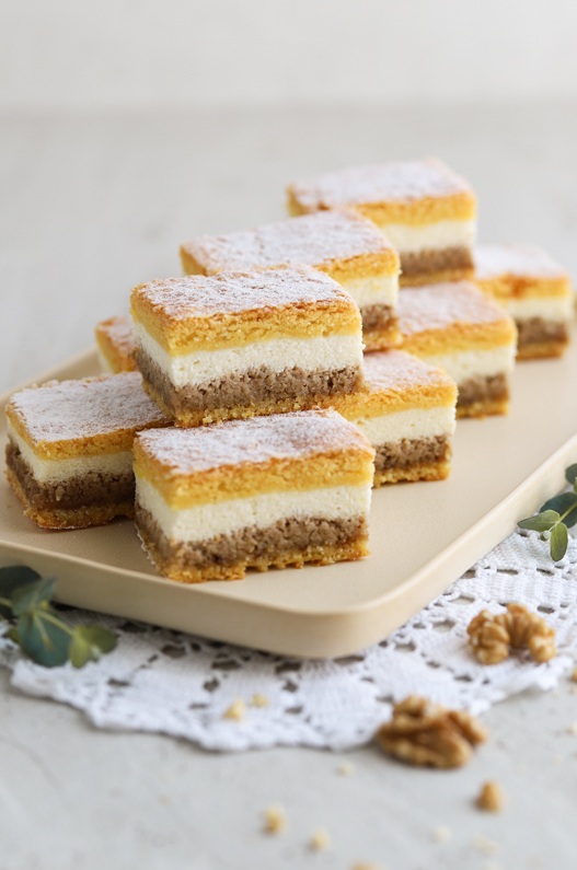 270 g mletih orehov 80 g sladkorja v prahu 4 žlice ruma 1 ščepec soli Sestavine za skutni nadev: 500 g nepasirane skute 100 g sladkorja v prahu 20 g vaniljevega sladkorja 2 žlici pšeničnega zdroba 4 beljaki