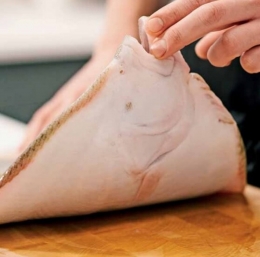 Filiranja romba se lotimo tako, da najprej zarežemo kožo nad hrbteničnim hrustancem in tik ob glavi.