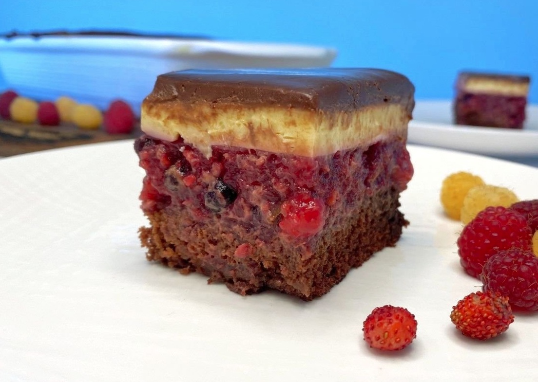 Slastna sladica z mehkim, sočnim biskvitom, osvežilnimi gozdnimi sadeži, masleno vanilijevo kremo in čokoladnim prelivom. Enostavno jo morate poskusiti.